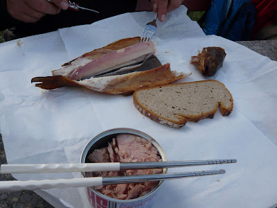 是一條煙燻的鱒魚配上一片我最討厭的酸麵包